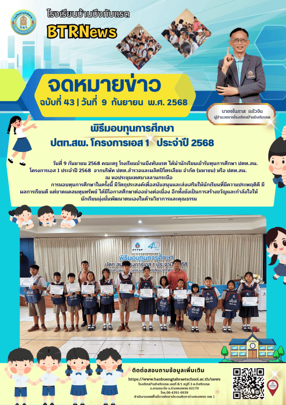 พิธีมอบทุนการศึกษา ปตท.สผ. โครงการเอส 1 ประจำปี 2568 วันที่ 9 กันยายน 2568 คณะครู โรงเรียนบ้านบึงทับแรต ได้นำนักเรียนเข้ารับทุนการศึกษา ปตท.สผ. โครงการเอส 1 ประจำปี 2568 จากบริษัท ปตท.สำรวจและผลิตปิโตรเลียม จำกัด (มหาชน) หรือ ปตท.สผ. ณ หอประชุมเ