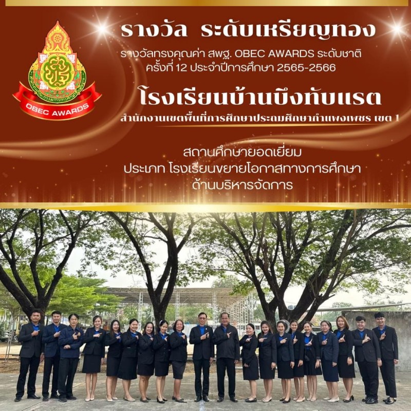 โรงเรียนบ้านบึงทับแรต สำนักงานเขตพื้นที่การศึกษาประถมศึกษากำแพงเพชร เขต 1 เนื่องในโอกาสได้รับรางวัลในระดับชาติ รางวัล ระดับเหรียญทอง "สถานศึกษายอดเยี่ยม ประเภทโรงเรียนขยายโอกาสทางการศึกษา ด้านบริหารจัดการ รางวัลทรงคุณค่า สพฐ. OBEC AWARDS ระดับชาติ ค