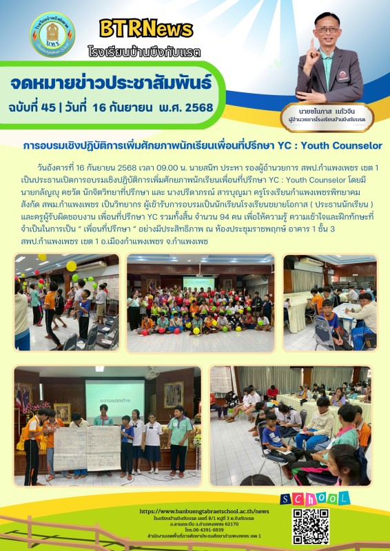 การอบรมเชิงปฏิบัติการเพิ่มศักยภาพนักเรียนเพื่อนที่ปรึกษา YC : Youth Counselor วันอังคารที่ 16 กันยายน 2568 เวลา 09.00 น. นายสนิท ประหา รองผู้อำนวยการ สพป.กำแพงเพชร เขต 1 เป็นประธานเปิดการอบรมเชิงปฏิบัติการเพิ่มศักยภาพนักเรียนเพื่อนที่ปรึกษา YC : Youth