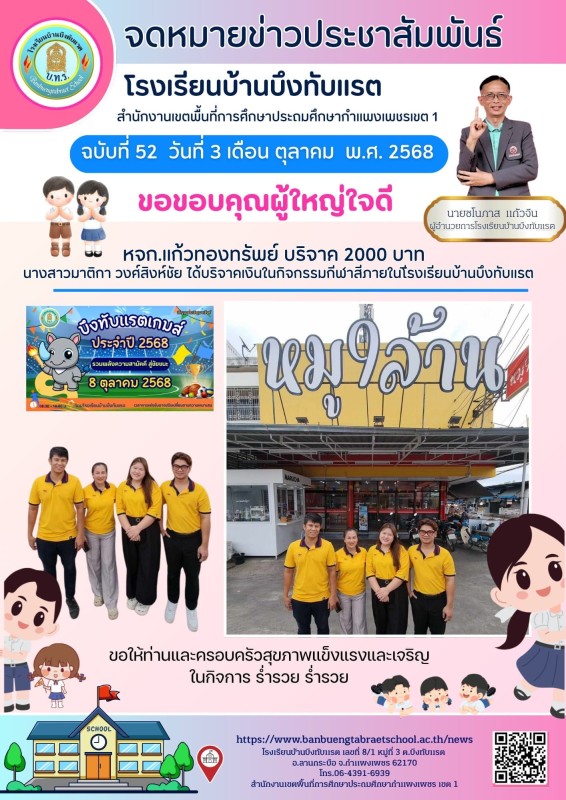 ????ขอขอบคุณผู้ใหญ่ใจดี???? หจก.แก้วทองทรัพย์ บริจาค 2000 บาท นางสาวมาติกา วงศ์สิงห์ชัย ได้บริจาคเงินในกิจกรรมกีฬาสีภายในโรงเรียนบ้านบึงทับแรต ขอให้ท่านและครอบครัวสุขภาพแข็งแรงและเจริญ ในกิจการ ร่ำรวย ร่ำรวย