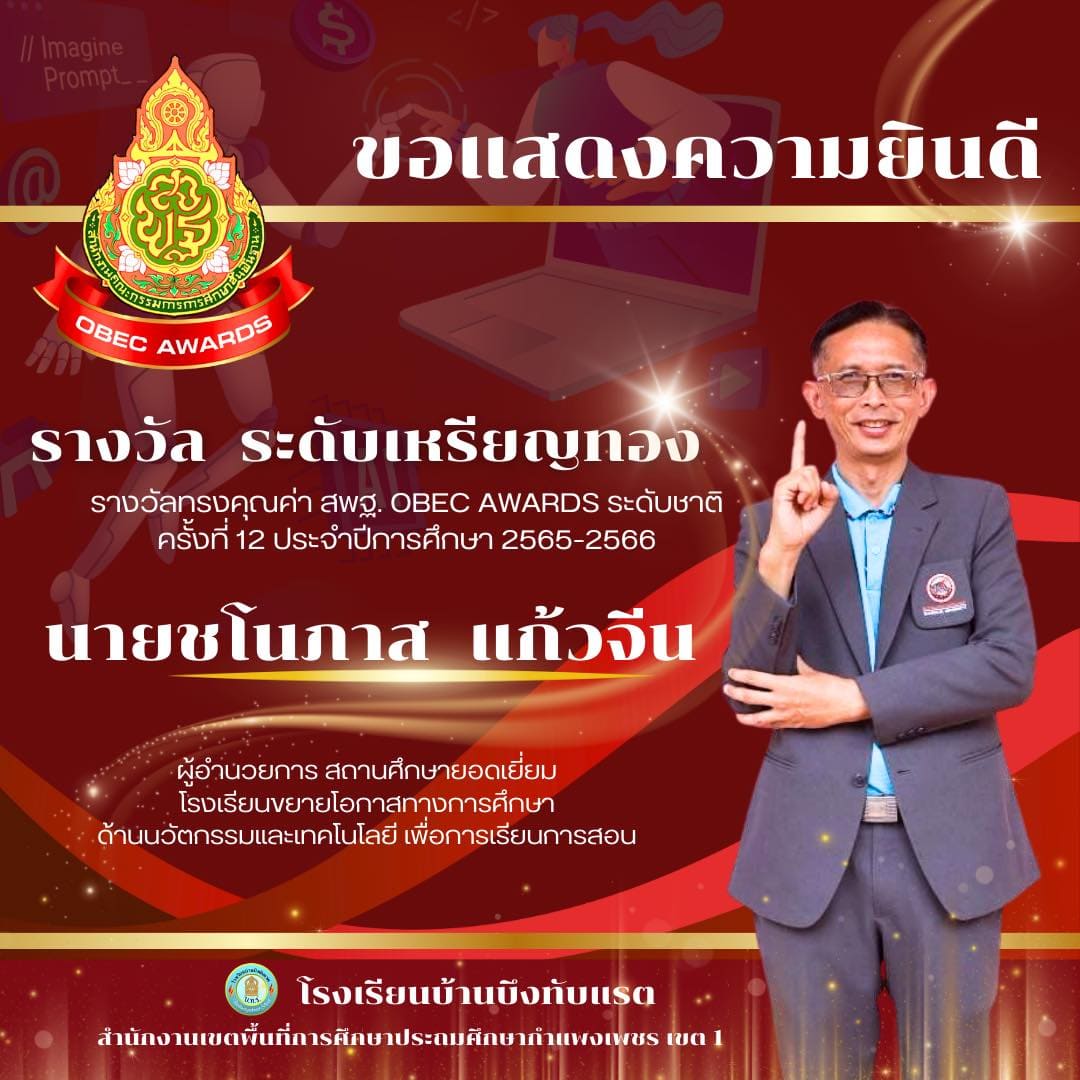 โรงเรียนบ้านบึงทับแรต "ขอแสดงความยินดี" นายชโนภาส แก้วจีน ผู้อำนวยการโรงเรียนบ้านบึงทับแรตสำนักงานเขตพื้นที่การศึกษาประถมศึกษากำแพงเพชร เขต 1 เนื่องในโอกาสได้รับรางวัลในระดับชาติ รางวัล ระดับเหรียญทอง "ผู้อำนวยการสถานศึกษายอดเยี่ยม โรงเรียนขยายโอกาสท